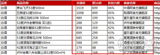 雖然這些商家尚未公開這些茅臺酒在雙11當(dāng)天的促銷價格,但是,在億邦動力網(wǎng)獲得的一份天貓公開的“爆款”商品名錄來看,幾家電商出售的酒類商品折扣力度均低于市場價的5折。其中,中酒網(wǎng)天貓旗艦店提供的一款53度500ml的茅臺飛天,雙11價格為699元,而市場價格則為1519元,折扣力度為46%。而在1919,一款五糧液+茅臺飛天組合爆款,售價只有1111元。