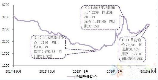 節(jié)點(diǎn):2016年“金三銀四”,鋼材市場走出了一個(gè)全新的高度。從標(biāo)識(2)處可以看到,市場打破之前所有束縛一崛而起,熱卷均價(jià)突破3000元/噸關(guān)口,比2015年12月份低點(diǎn)漲幅達(dá)30.27%。從庫存方面來看,熱卷同期庫存在157.99萬噸,同比跌36.15%;而關(guān)于鋼價(jià)回暖的因素諸多,此時(shí)在低庫存托底情況下,助力市價(jià)一躍而起。